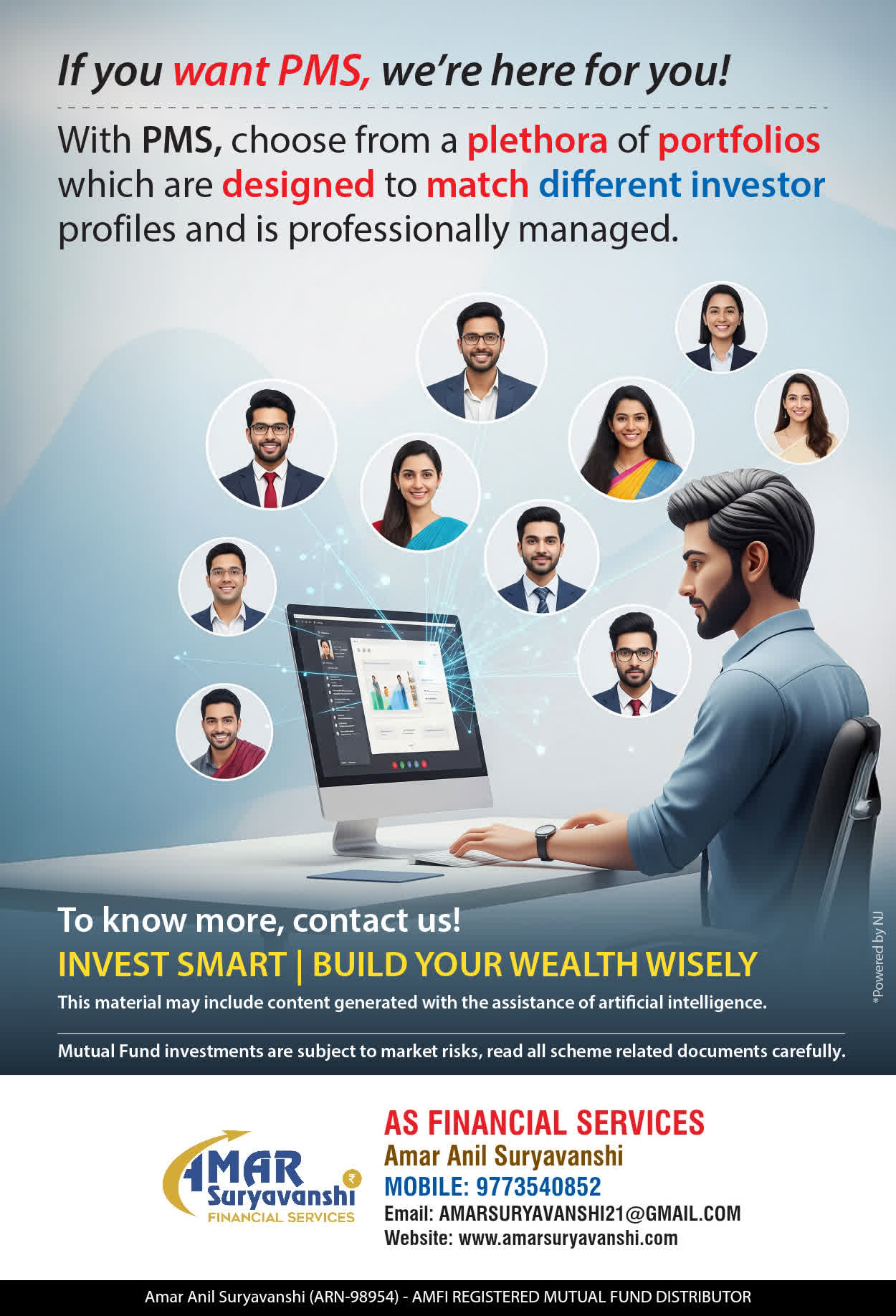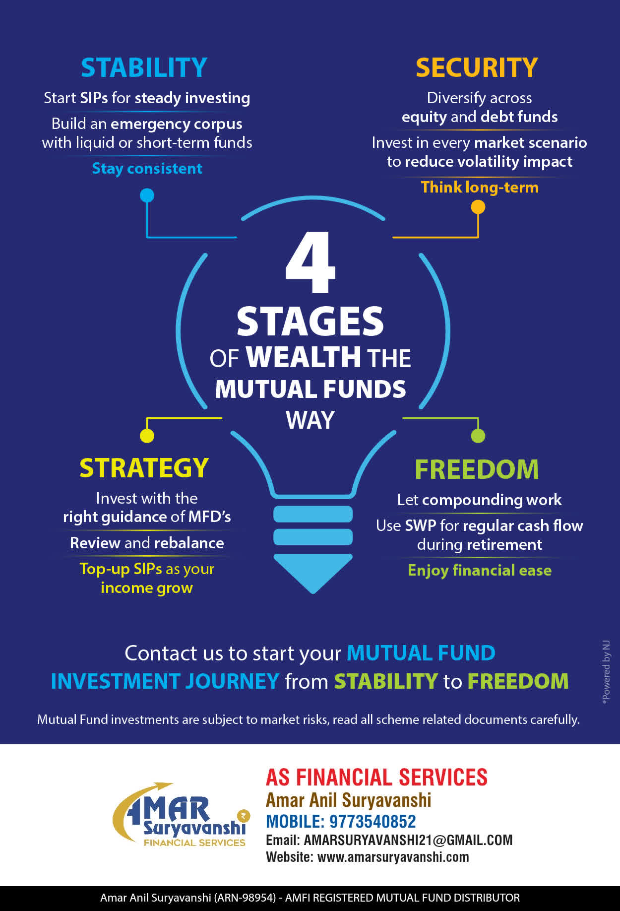 We offer our services through personal guidance with each of our clients after understanding their investment needs. Our approach is to enable our clients to understand their investments, know investment products and make proper progress toward achieving their financial needs in life.